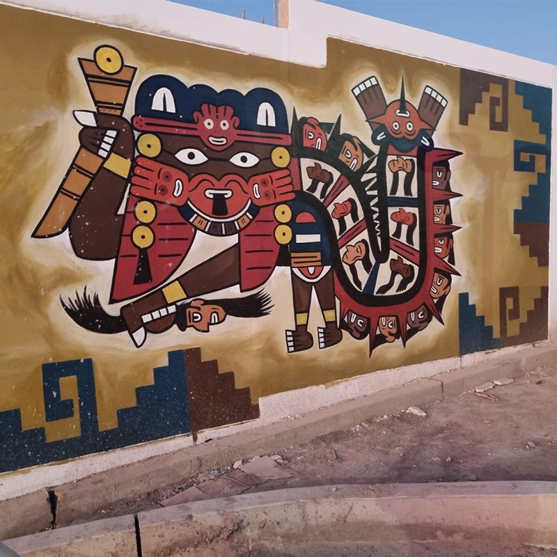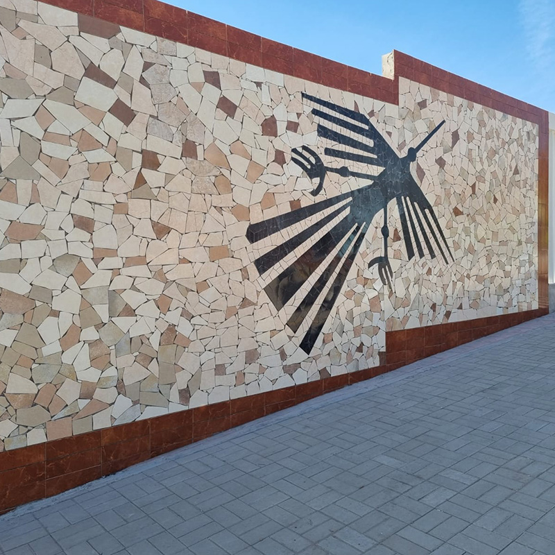Nuestra empresa llevó a cabo una ambiciosa serie de proyectos de mejora en el Boulevard de vista alegre, que incluyeron la instalación de adoquines en el frontis para mejorar la funcionalidad y la estética, así como el revestimiento de bancas con terrazo rústico blanco para un toque de elegancia y comodidad, la aplicación de concreto estampado en áreas de juegos para mayor atractivo y color, la creación de murales de alto relieve y el enchape de murales de mosaico que rinden homenaje a nuestra cultura Nasca.